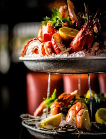 A bounty from the sea stacked high with chilled crab, lobster tail, jumbo shrimp, and oysters on the half shell.
